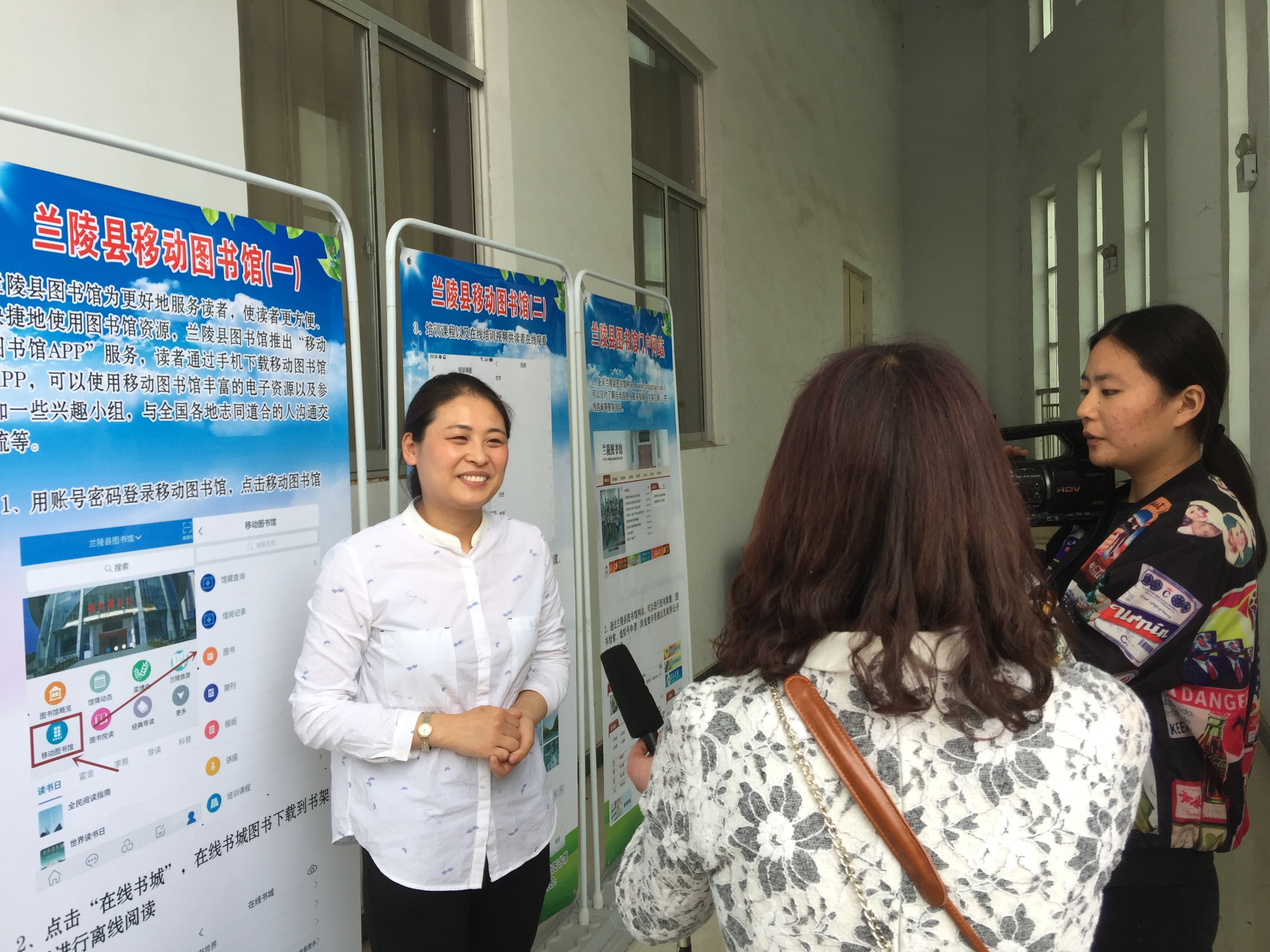 兰陵县图书馆职工面对镜头介绍移动图书馆的使用。
