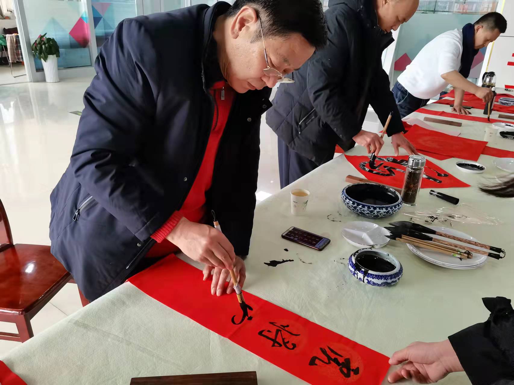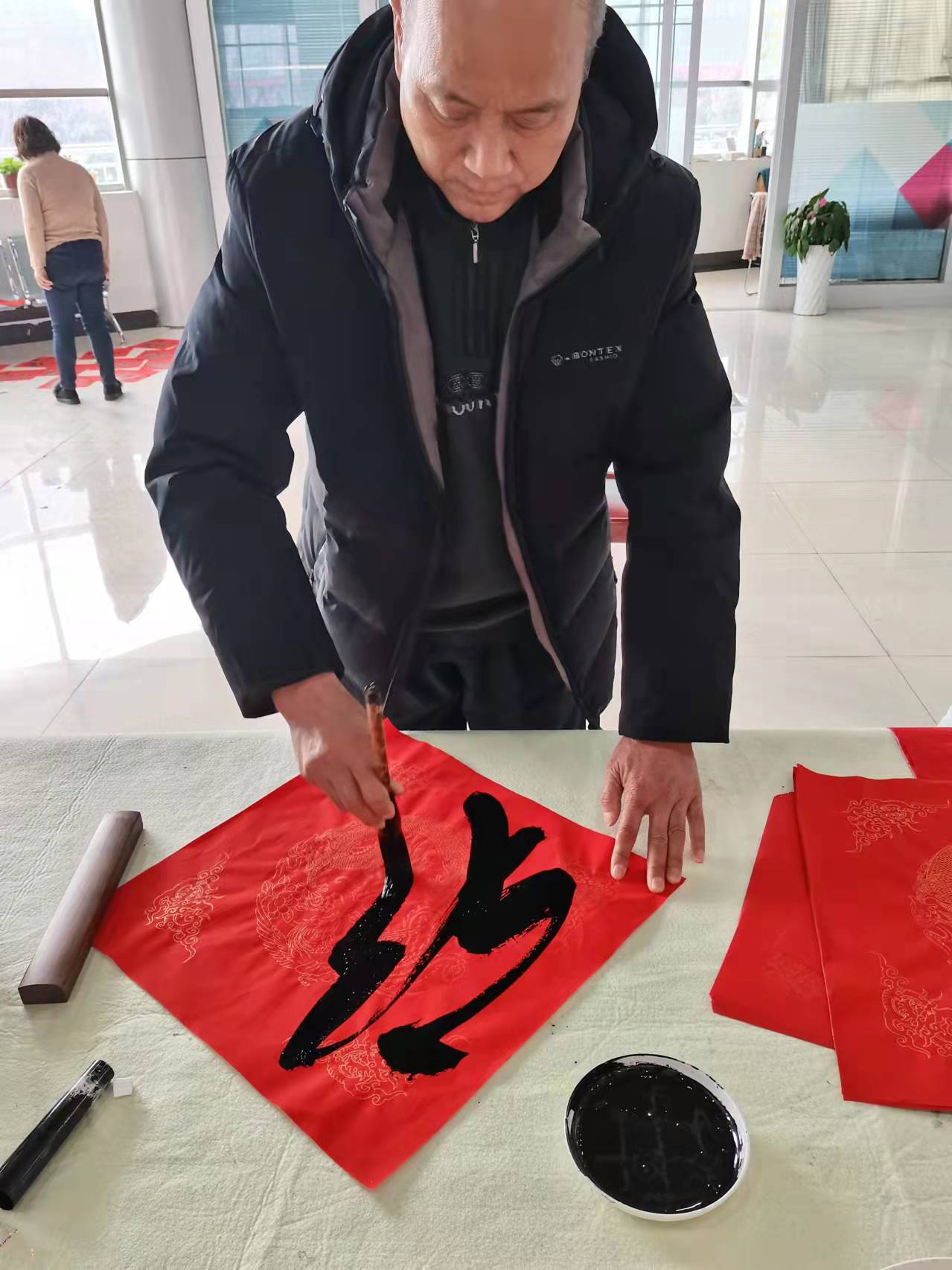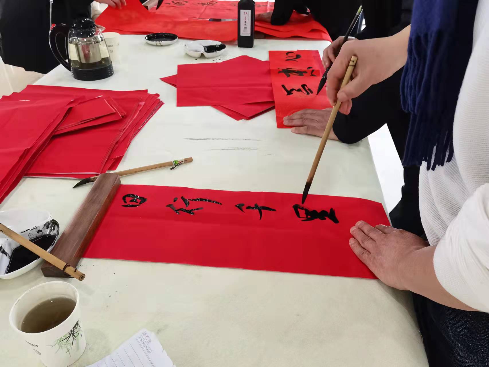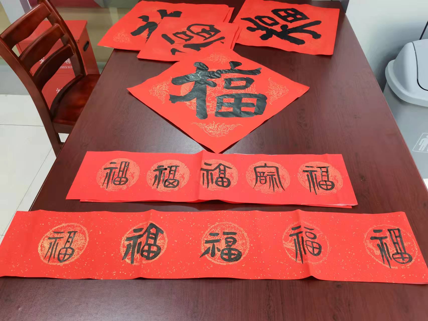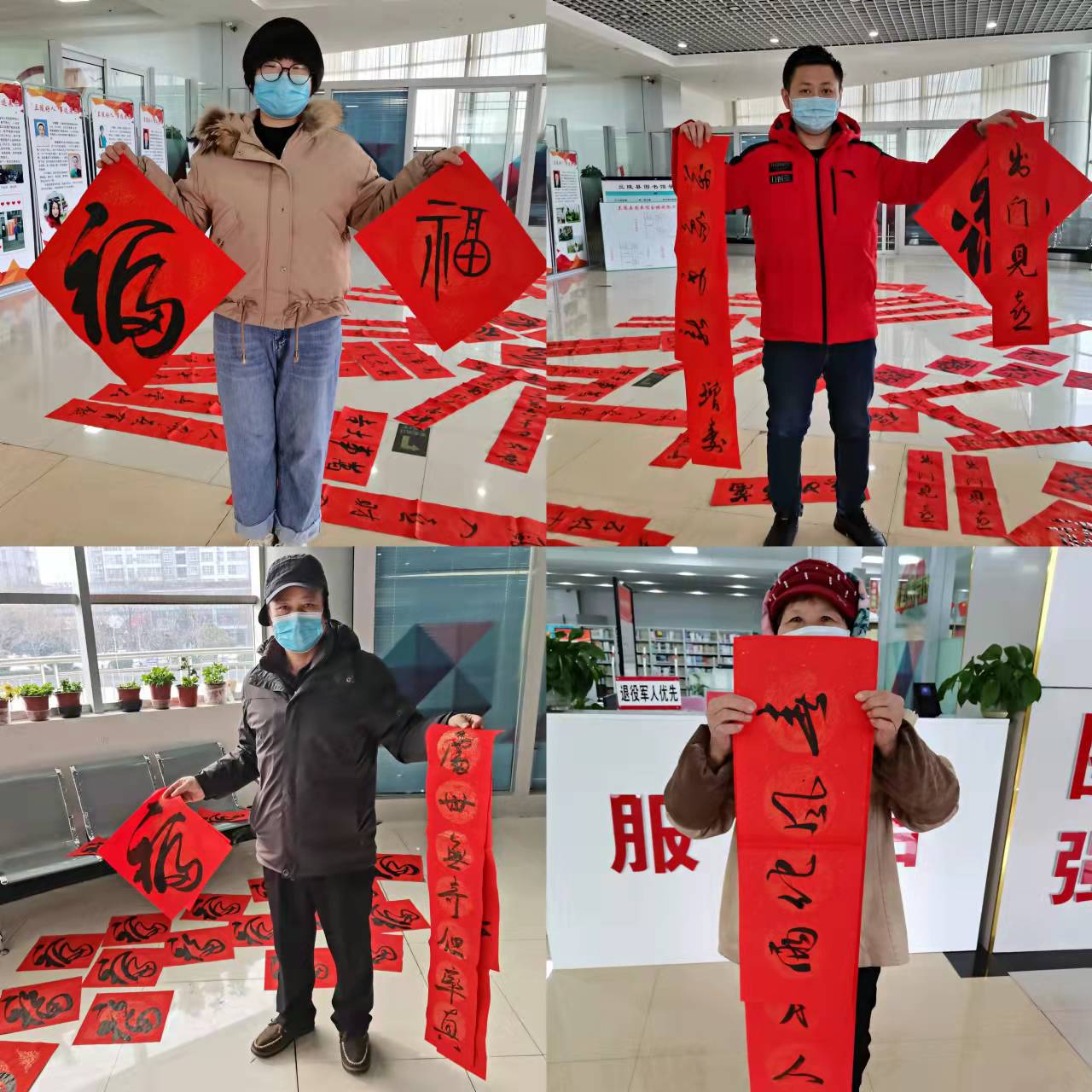 一幅幅带着美好寓意的春联和大红福字送到群众手上,他们小心翼翼地将写好的春联和福字晾干收好,连连称赞。
