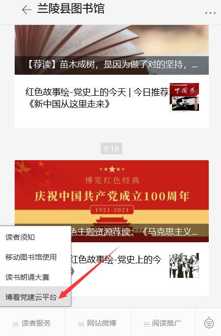 1)关注兰陵县图书馆微信公众号,点击菜单【读者服务】进入【博看党建云平台】,或者识别文中二维码均可进入答题通道。