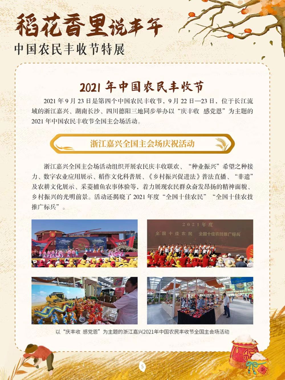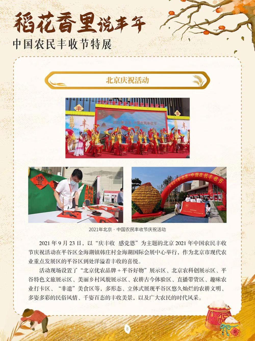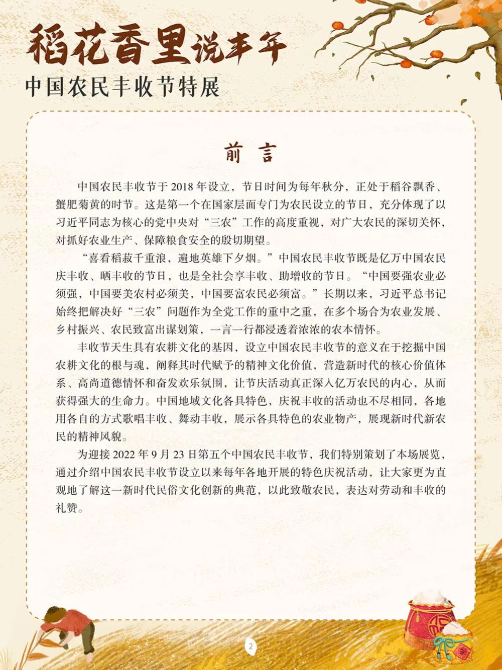 中国农民丰收节于2018年设立,节日时间为每年秋分,正处于稻谷飘香、蟹肥菊黄的时节。这是第一个在国家层面专门为农民设立的节日。中国地域文化各具特色,庆祝丰收的活动也不尽相同,各地用各自的方式歌唱丰收、舞动丰收,展示各具特色的农业物产,展现新时代新农民的精神风貌。为迎接2022年9月23日第五个中国农民丰收节,我们特别策划了本场展览,通过介绍中国农民丰收节设立以来每年各地开展的特色庆祝活动,让大家更为直观地了解这一新时代民俗文化创新的典范,以此致敬农民,表达对劳动和丰收的礼赞。
