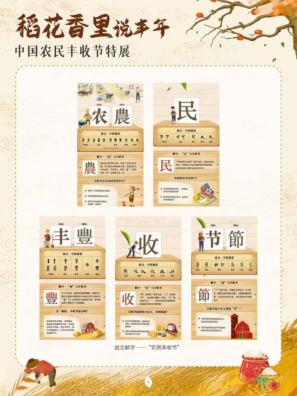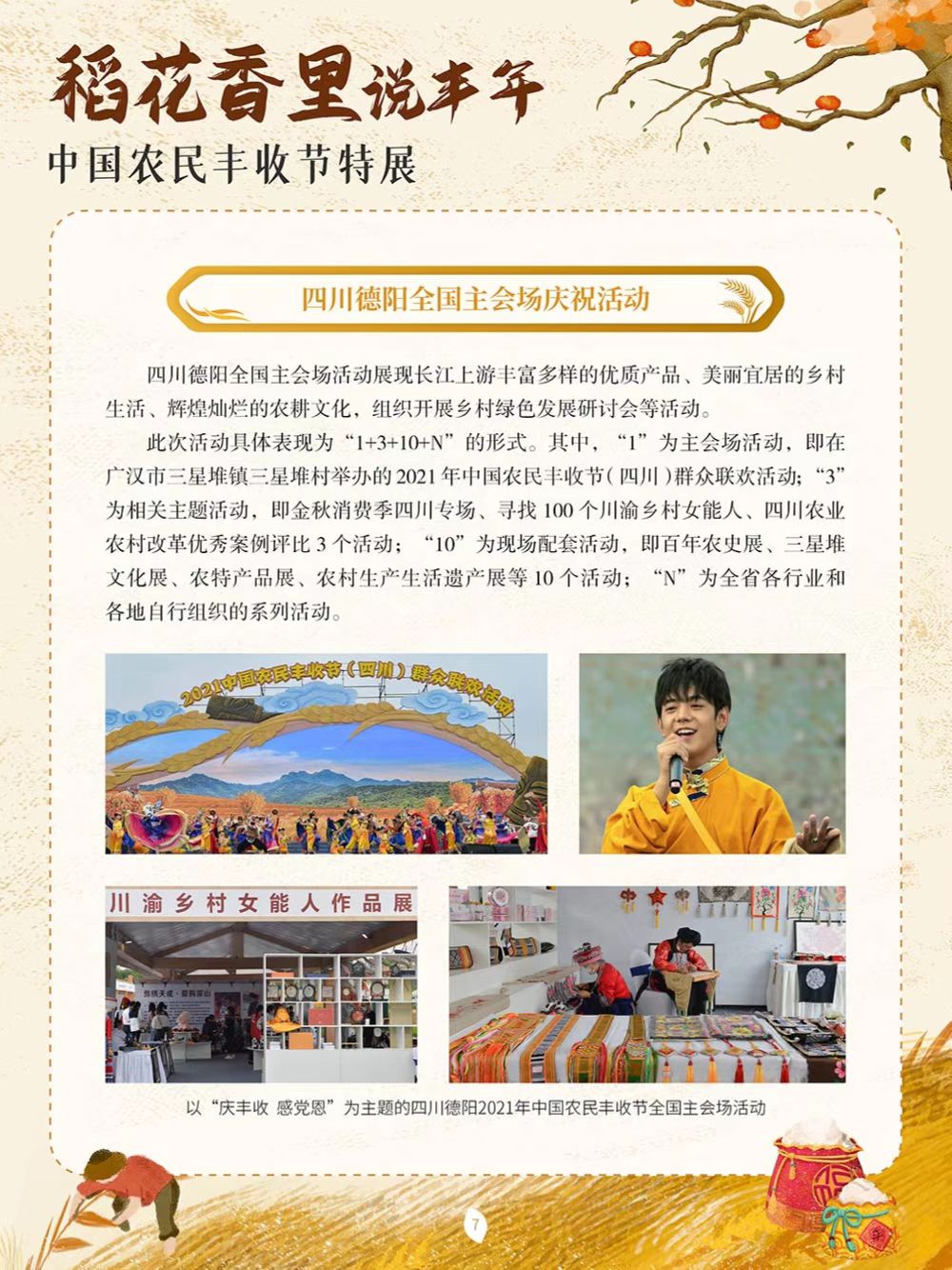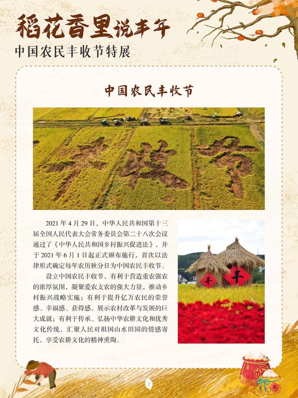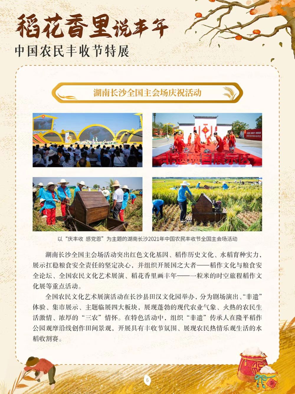 中国农民丰收节于2018年设立,节日时间为每年秋分,正处于稻谷飘香、蟹肥菊黄的时节。这是第一个在国家层面专门为农民设立的节日。中国地域文化各具特色,庆祝丰收的活动也不尽相同,各地用各自的方式歌唱丰收、舞动丰收,展示各具特色的农业物产,展现新时代新农民的精神风貌。为迎接2022年9月23日第五个中国农民丰收节,我们特别策划了本场展览,通过介绍中国农民丰收节设立以来每年各地开展的特色庆祝活动,让大家更为直观地了解这一新时代民俗文化创新的典范,以此致敬农民,表达对劳动和丰收的礼赞。