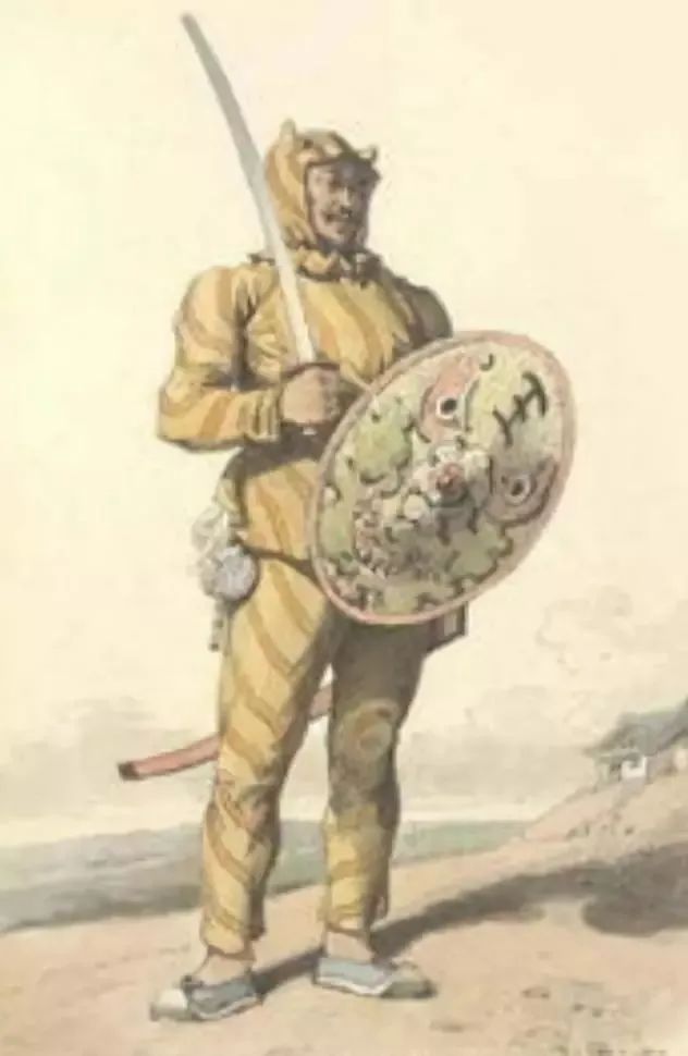 他们身着虎纹套装、手持藤牌和砍刀