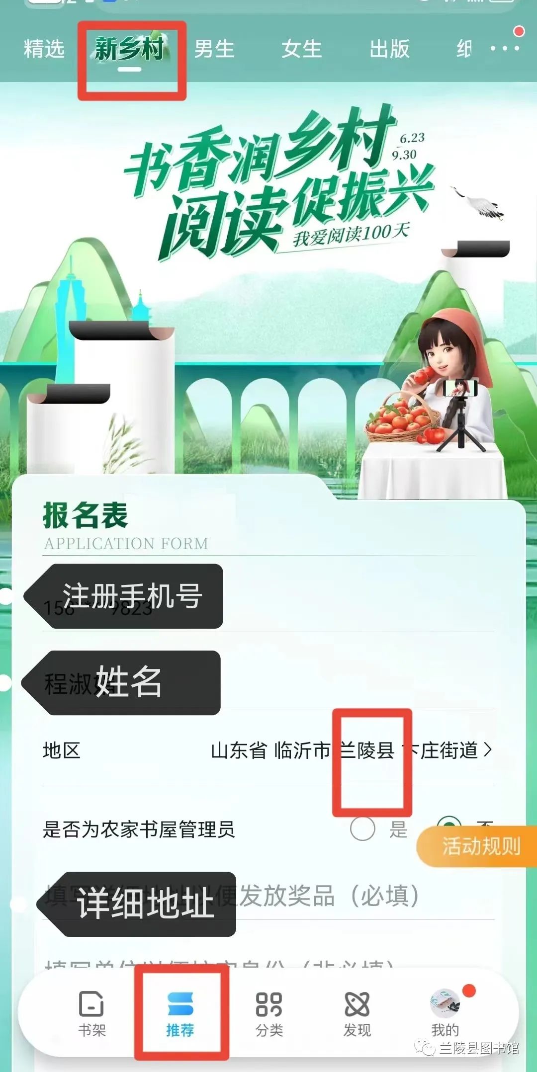 2.完成安装后打开咪咕阅读APP,点击下方的“推荐”,随后点击上方“新乡村”填写注册信息。特别注意:注册地址要选择临沂市兰陵县XX镇或临沂市兰陵县XX街道,详细地址填到社区或者村庄。