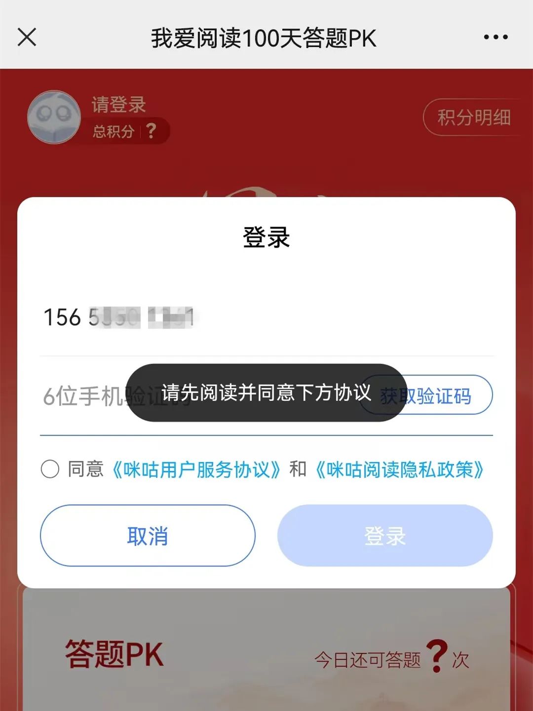 4.今年的活动增加了答题积分内容,点击积分页面的答题链接,可进入“我爱阅读100天”微信公众号,选择答题PK即可完成答题,每天可答题3次。答题前需绑定咪咕阅读注册的手机号,以便同步数据。
