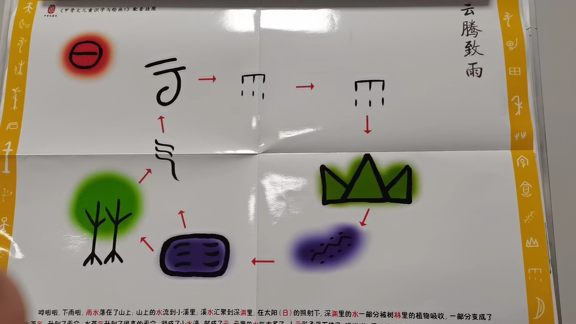 今天的甲骨文课,学习了云腾致雨:云—雨—山—水—渊—气。哗啦啦,下雨了,雨水落到了山上,山上的水流到了小溪里,溪水汇聚到深渊里,在太阳的照射下,深渊里的水一部分被树林里的植物吸收。一部分变成了水蒸气升到了天空,水蒸气升到了天空,就变成了云朵,水气太多了,云朵承受不住,哗啦啦,雨水又落到了山上。